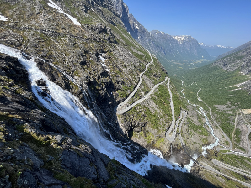Heute macht die Hälfte der Healeyfahrer eine Ausfahrt nach Loen. Über den Pass bei Dalsnibba geht es ins Hjelledalen entlang am Oppstrynsvatnet bis nach Loen. Wir müssen durch einige, teils sehr lange Tunnel. In Loen fahren wir in 5 Minuten mit der Luftseilbahn (eine der steilsten der Welt) auf den Mt. Hoven. Oben hat man einen wunderbaren Aus- und Überblick über die Bergwelt Fjordnorwegens, Jotunheimen und den Jostedalsbreen, den größten Gletscher Kontinentaleuropas. Das Mittagessen mit Panoramablick ist hervorragend und etwas Besonderes: Rentiergulasch mit Pilzen und Kartoffelpüree. Als wir wieder am Parkplatz sind, sind schon viele Healeys abgefahren. Aber an der Baustelle im Tunnel treffen wir aufeinander und ab der Abzweigung nach Geiranger reihen sie sich aneinander. Manche behandeln ihr Auto bei einem Gefälle von 10% wie einen chrome – wheelchair. Ein erlebnisreicher Tag geht für uns zu Ende.